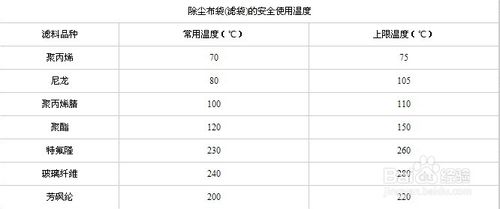 表列出了可連續使用兩年的除塵布袋(濾袋)常用溫度,以及考慮到由于管理上偏差而允許的上限溫度。