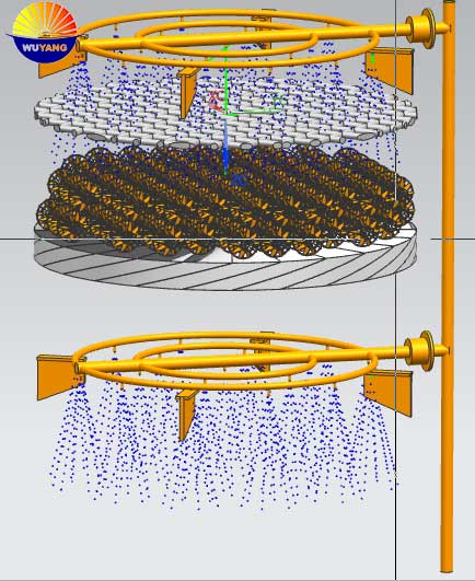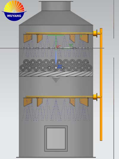 為了避免氣體攜走噴淋液,在塔頂部氣水分離器,有效截留噴淋液。噴淋液循環使用,在使用過程中會有部分損失,位于塔底的循環水箱適時補充噴淋液。、