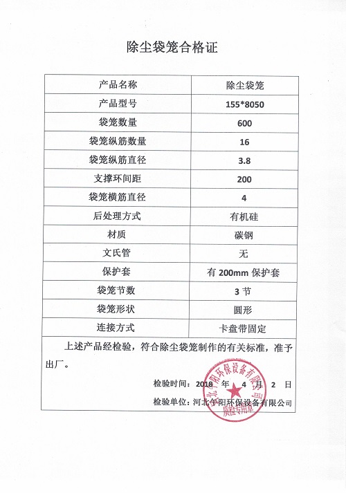 鋼廠除塵器改造案例@除塵袋籠出廠檢驗合格證明-河北午陽環保設備有限公司
