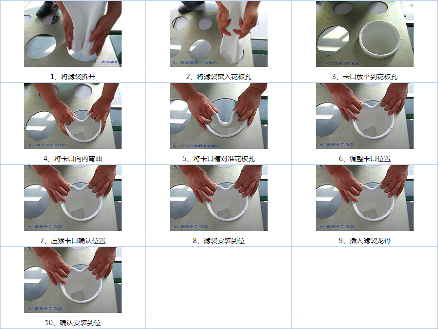 在布袋除塵器的安裝、調(diào)試工作中,除塵布袋、骨架與花孔板的安裝是全部安裝中_小心和仔細(xì)的工作,因此應(yīng)放在_后進(jìn)行安裝,安裝時,布袋切不可與尖硬物碰撞、鉤劃,即使是小的劃痕,也會使布袋的壽命大大縮短。安裝除塵器布袋的方法是先將布袋由箱體花板孔中放入袋室,然后將袋口上部的彈簧圈捏成凹型,放入箱體的花孔板中,再使彈簧圈復(fù)原,使其緊密地壓緊在花孔圓周上,_后將除塵器袋籠從袋口輕輕插入,直到袋籠上部的護(hù)蓋確實(shí)壓在箱體內(nèi)花板孔上為止。為防止布袋踩壞,要求每裝好一個布袋,_裝一個除塵骨架。濾袋、除塵袋籠與花孔板的安裝(附圖)。