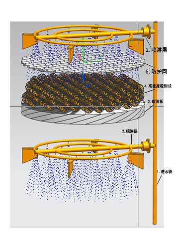 采用噴淋降塵、霧化吸收、液膜傳質和沖擊湍流4種工藝手段,巧妙地結合脫硫除塵技術,
