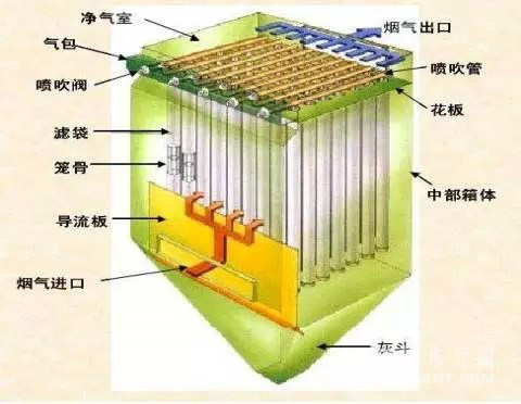 袋式除塵作用機(jī)理:利用特種纖維制成濾袋,將含塵氣體噴入濾袋中,用濾袋過濾和捕集粉塵,過濾效果取決于濾袋的質(zhì)量。