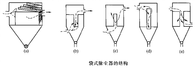 圖 (c) 和圖 (e) 為內濾式袋式除塵器,含塵氣流由濾袋內側流向外側,粉塵沉積在濾袋內表面上。其優點是濾袋外部為清潔氣體,便于檢修和換袋,甚至不停機即可檢修。一般機械振動、反吹風等清灰方式多采用內濾形式。