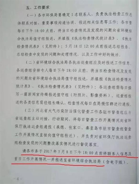 2、檢查方式及開展時間:于2017年5月8日—5月17日以省、市、縣(市、區(qū))聯(lián)動執(zhí)法,省環(huán)保廳成立執(zhí)法巡查組,河北省大氣污染防治強化督查工作各駐市督查組,各市組織市本級和各縣(市、區(qū))執(zhí)法人員,采取明查與暗查及日常檢查與不定期突擊檢查相結(jié)合,加強集中排查力度,集中查處重點環(huán)境違法行為;