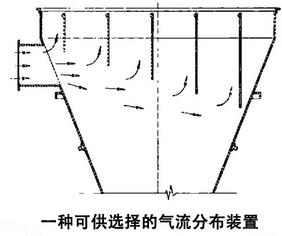 這種設計不能達到氣流均布的目的。氣流不均勻,實質是氣流各部位的速度(亦即動壓)不均勻,局部氣流速度過高。氣流均布的目的,應是消除局部過高的流速,使氣流各部位速度趨于 均勻。為此,氣流分布板應當處于氣流的正面,置于氣流之中,使過高的動壓得以消耗。但上圖所示的氣流分布板置于含塵氣流的側面,幾乎_不能消耗氣流過高的動壓,于是,從灰斗進入的含塵氣流憑借慣性集中流向灰斗遠端的板壁,并順著壁面向上流動,攜帶粉塵以較高的速度對該處濾袋形成沖刷,導致靠近遠端壁面第di一和第di二排的濾袋破損。