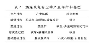 在輸煤過程和燃燒過程會產生大量的煙氣粉塵,燃煤電廠生產過程中也會產生很多粉塵,主要有煤塵、石灰石粉塵、石膏粉塵及矽塵等。在一般生產過程中粉塵的產生場所和粉塵類型見表2。
