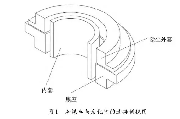 1.1加煤車與炭化室的連接6m 焦?fàn)t加煤車根據(jù)焦?fàn)t狀況,一般設(shè)置有四套加煤裝置,分別對應(yīng)四個加煤口。在加煤時,加煤裝置的內(nèi)套進(jìn)入加煤口,除塵裝置外套與加煤口底座對接,內(nèi)套和除塵裝置外套之間形成除塵通道。如圖 1 所示。