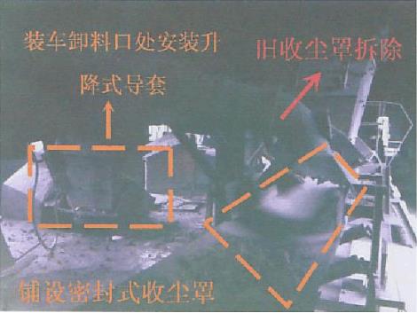 在裝車卸料口處安裝升降罩,裝車卸料時升降罩延伸到下方的車輛上,解決裝車時產生的二次揚塵。每個卸料口旁邊的集塵管道上配備一臺電動蝶閥( 或氣動蝶閥)