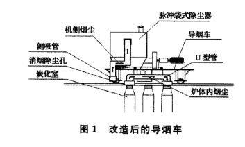 導煙車是U型管導煙技術的核心,主要包括兩個部分:側導系統和側吸系統。側導系統是把裝煤過程的煙塵導入相臨炭化室的裝置,由U型管、提升裝置組成。側吸系統是收集、處理機側爐門逸散煙塵的裝置,由風機、布袋除塵器、預噴涂系統、移動式空壓機、側吸管等組成。為了確保側吸系統盡可能多的收集機側煙塵,在機側爐門上安裝了熱浮力罩,把逸散的煙塵匯集后通過側吸系統進行處理。改造后的導煙車如圖: