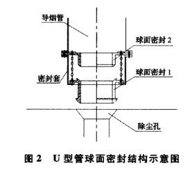 原U型管的材質為不銹鋼制作,在作業過程中由于活動套的起落不順暢們造成卡阻現象,導致U型管密封效果差。針對這種情況我公司將U型管材質改為鑄鋼,縮小導套直徑,增加壁厚,密封面采用球面密封,在球面密封外部加裝1個固定式密封套,形成雙層密封。改造后球面密封與除塵孔緊密結合,密封效果明顯,且抗熱變形的能力大大提高,在風機吸力相同的情況下,U型導煙效果有了很大提升。